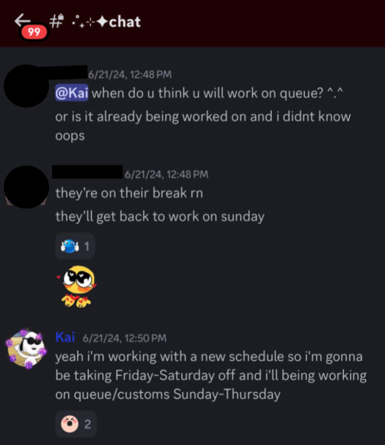 If this behavior continues, it could lead to legal trouble for failing to deliver paid work, no matter which payment method. This would be bad with the amount of commissions they have. Strict solutions, improving communication, and prioritizing overdue commissions MUST be followed to rebuild trust and avoid further problems.